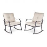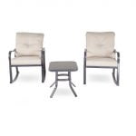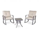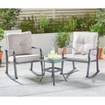 Sit back and rock away in style with this stunning Gardenline Rocking Bistro Set. Add this dining set of 2 chairs and a table to your garden space. The gentle rocking action and table with glass top make this a perfect set for relaxing and dining al fresco. Each seat comes with a seat and back cushion so you can also relax in comfort and enjoy those long summer evenings in style.