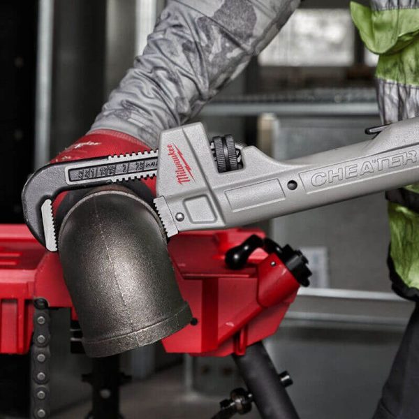 • The Milwaukee CHEATER aluminium adaptable pipe wrench is the most adaptable pipe wrench with an all-in-one design that delivers maximum productivity to the professional user. With a multi-length, quick slide handle that locks anywhere the aluminium cheater pipe wrench gives you the flexibility of an 11″ or an 18″ to 24″ aluminium pipe wrench. The Cheater pipe wrench features an overbite jaw offering the largest grip surface. The best adaptable pipe wrench by Milwaukee is just like the basin wrench, the Cheater pipe wrench is a must have for any plumbers toolbox.