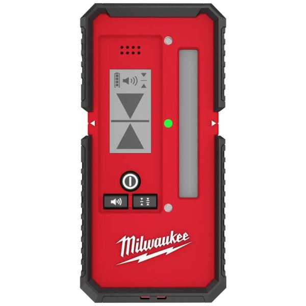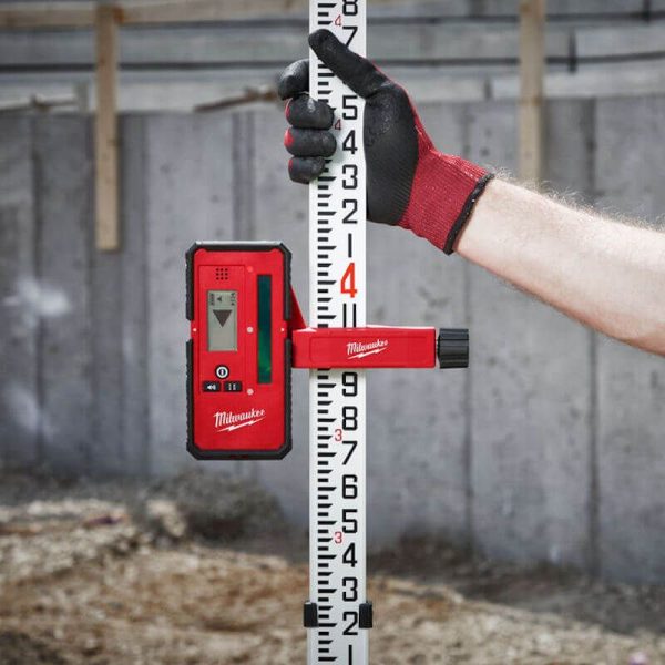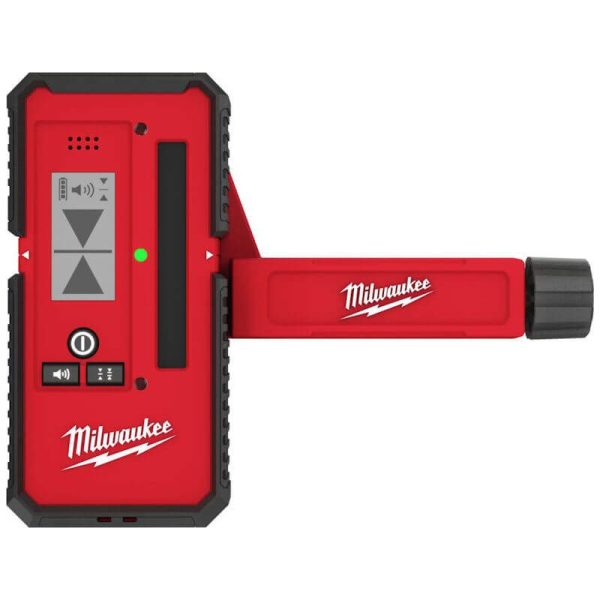 - The Milwaukee laser line detector extends the laser functionality to up to 50m indoors and outdoors for fast point-to-point alignment. The front and back LEDs on the laser level receiver provide users with high visibility feedback improving the set-up process. Rare earth magnets located on two sides of the detector allow it to easily attach to metal surfaces, ideal for ceiling grid installation. The best laser receiver for Milwaukee laser levels and also features adjustable audio.