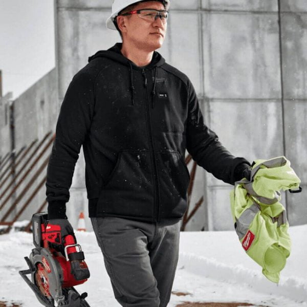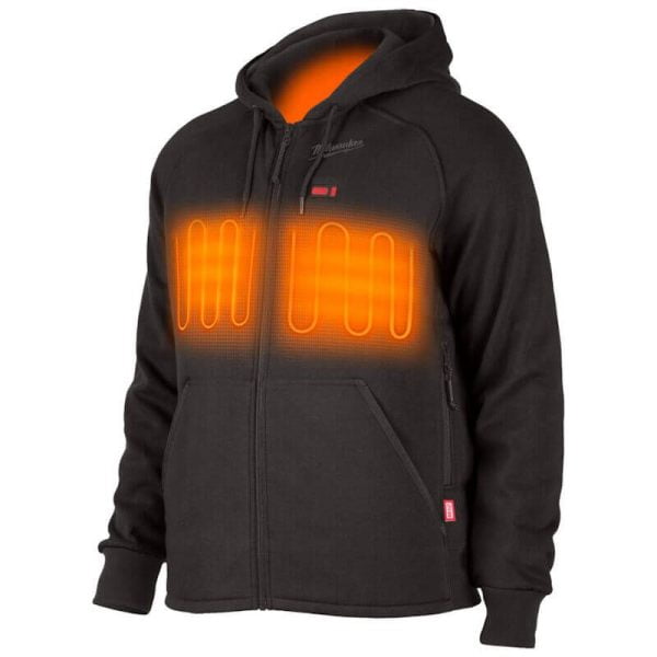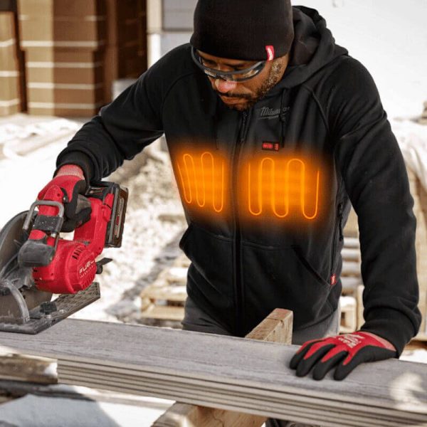 • M12™ Heated Hoodie powered by an M12™ battery with carbon fibre heating elements creates and distributes heat to chest and back.