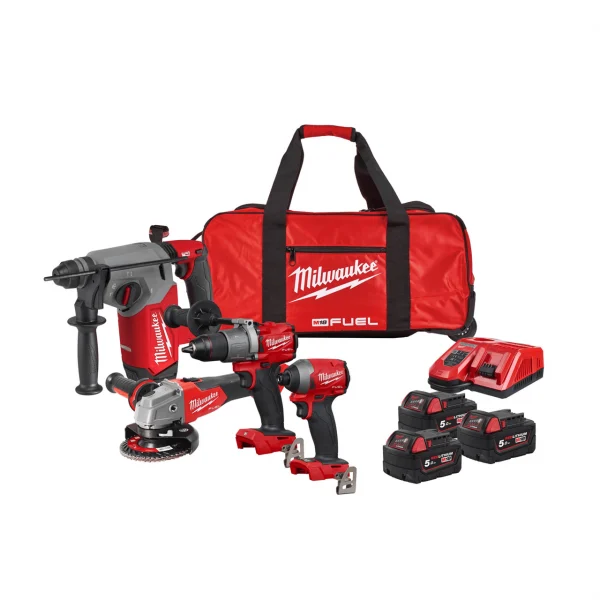 • The Milwaukee M18 FPP4Z-503B is a 4 piece kit with a brilliant selection of power tools from Milwaukee including the FPD2 M18 FUEL Percussion Drill,  FID2 M18 FUEL 1/4″ Hex Impact Driver, FH-0 M18 FUEL 4-mode 26mm SDS-Plus Hammer and FSAG115X M18 FUEL 115mm Angle Grinder with Slide Switch. All these tools feature Milwaukees POWERSTATE Brushless motor which provides sustained power during heavy application