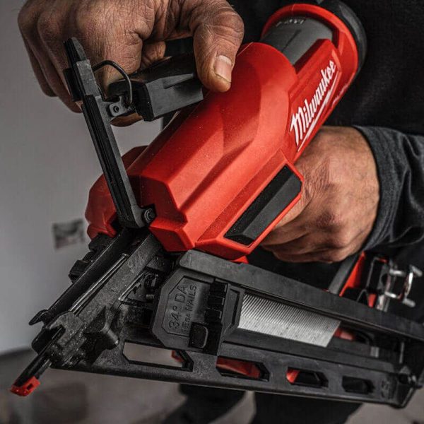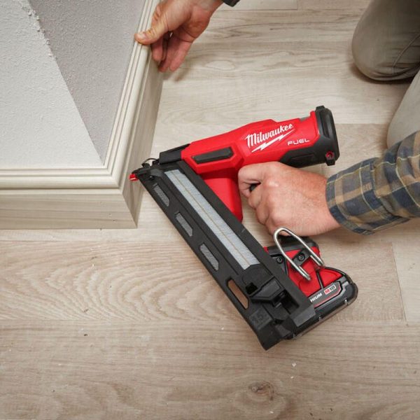 • The Milwaukee M18 15ga angled brad nailer provides peak productivity at your jobsite, delivering unmatched nailing performance without the hassle of a compressor and hose. This cordless 15 gauge nailer uses a nitrogen air spring mechanism, the 15 gauge nailer allows the user to consistently sink nails to the required depth in hard and soft woods while leaving clean nail holes, allowing for repeatable results and easy filling. The Milwaukee M18 FUEL 15 GA angled nail finish nailer 2-mode is the best cordless nailer with zero ramp-up time from nail to nail, for minimal down time and maximum efficiency throughout the job with a compact and ergonomic design providing access into tight spaces where nailing is required. The Milwaukee M18 FN15GA cordless 15 gauge angled finishing nailer can be used in combination with the Milwaukee 10 inch mitre saw to flush fit skirting boards after being mitred and cut to length.