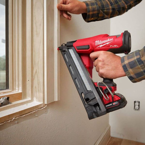 • The Milwaukee M18 15ga angled brad nailer provides peak productivity at your jobsite, delivering unmatched nailing performance without the hassle of a compressor and hose. This cordless 15 gauge nailer uses a nitrogen air spring mechanism, the 15 gauge nailer allows the user to consistently sink nails to the required depth in hard and soft woods while leaving clean nail holes, allowing for repeatable results and easy filling