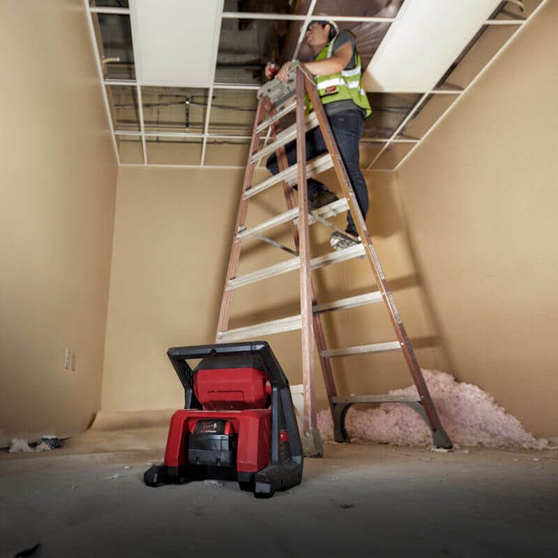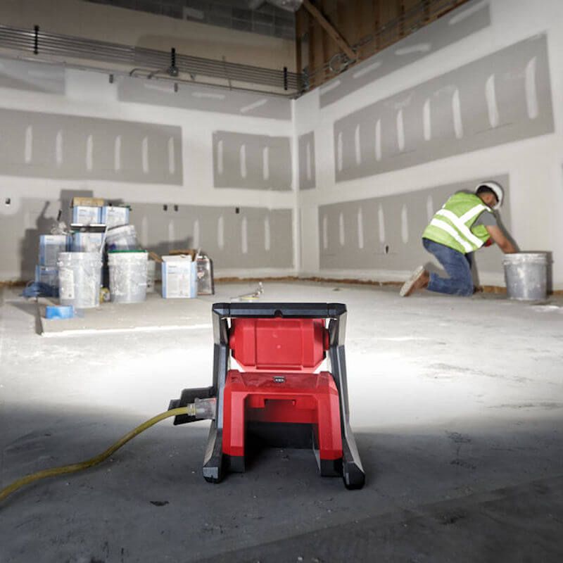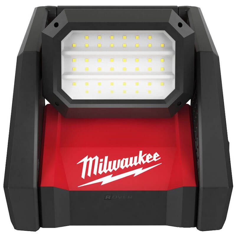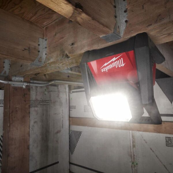 • The Milwaukee Rover flood light provides users with 4000 lumens of TRUEVIEW high definition output designed to fill large areas with light. This cordless area light features three light modes and up to 12 hours of run-time when paired with an M18 REDLITHIUM-ION 5.0Ah Battery Pack (sold separately). The Milwaukee M18 high output area light is the best cordless flood light and features an AC inlet, giving the user the option to plug in an extension cord for all day runtime. The light head rotates 120° to direct light in multiple orientations. The Milwaukee M18 HOAL cordless Rover flood light includes integrated keyholes on its base for hanging overhead to illuminated surfaces when drilling holes with the compact Milwaukee M12FPD combi drill or clearly demolishing areas with cordless hammer drills.