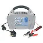 • Fully automatic 8A battery charger suitable for 12V vehicles. Easy to read LED indicators. Storage for battery clips and AC plug