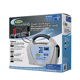 • Dual voltage 6A charger, suitable for 6 and 12V vehicles including cars, vans and motorcycles. Includes 2 battery clamps.