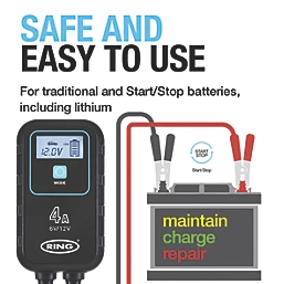 • Ring SmartCharge 4 is a compact, lithium compatible, 12V battery charger and maintainer built for professional vehicle maintenance, providing efficient 4A charging for 6V and 12V vehicle batteries in cars, motorcycles and caravans. Suitable for petrol and diesel engines up to 2.0L, including start/stop systems. A 9-stage smart charging cycle automatically diagnoses, reconditions and maintains lithium-ion and lead-acid batteries including AGM, EFB and gel, helping extend service life. Rejuvenates and protects battery health. IP65 weatherproof protection suits indoor and outdoor use, while cold weather mode adjusts charging in low temperatures to prevent damage. Also features LCD display for clear charging status, and polarity, short‑circuit, overload, and thermal protection. Supplied with clips, O‑rings, quick-release cables, and hanging hook for safe and convenient connection.