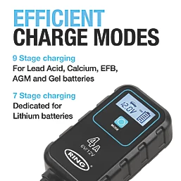 • Ring SmartCharge 4 is a compact, lithium compatible, 12V battery charger and maintainer built for professional vehicle maintenance, providing efficient 4A charging for 6V and 12V vehicle batteries in cars, motorcycles and caravans.