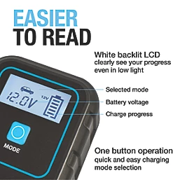 • Fully automatic 8A battery charger suitable for 12V vehicles. Easy to read LED indicators. Storage for battery clips and AC plug