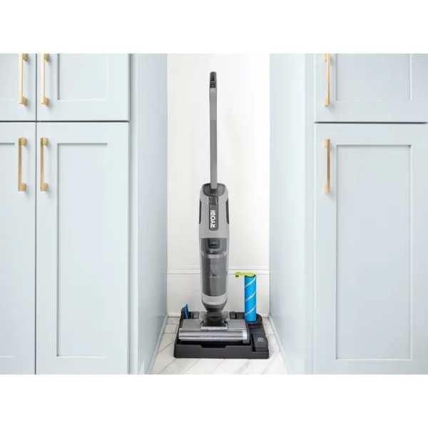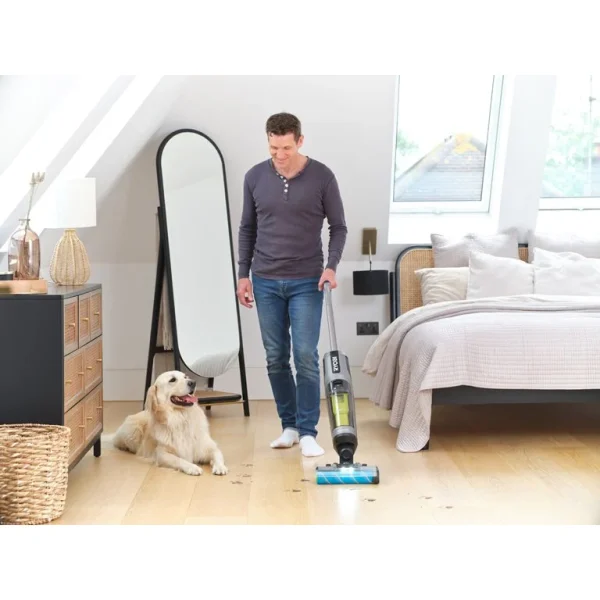 Firstly, it will suck-up dirt and hair like a standard self-standing stick vacuum, secondly it’s designed with a two-tank cleaning system, ensuring a continuous feed of hygienic clean water (when mixed with included solution) which is distributed evenly through the front roller to mop-up engrained dirt and debris whilst the dirty water is collected in the second tank. Finally, it dries leaving only a thin layer of clean water which will dry within minutes – say goodbye to pushing around dirty water like you would with a traditional mop and there’s no more scrubbing either!