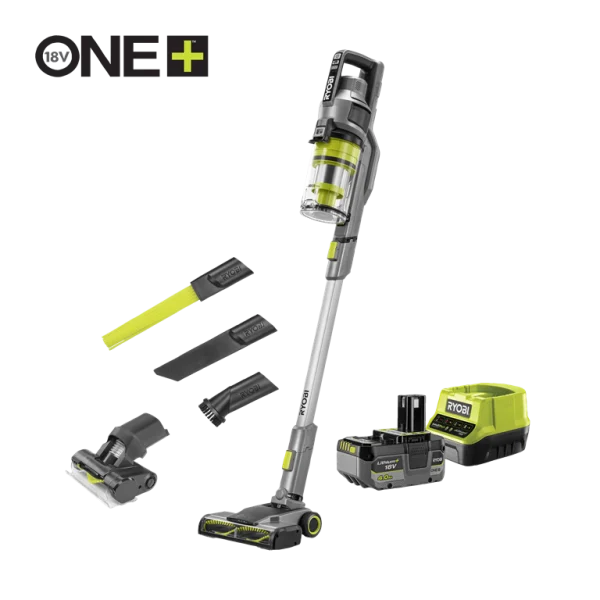 This cordless stick vacuum from Ryobi delivers powerful suction and along with its easy-to-use design makes light work of cleaning hard floors, carpet and upholstery. Utilising the power of the ONE+™systems’ interchangeable batteries, this cordless vacuum cleaner is without the inconvenience of a typical clunky, hard-to-manoeuvre vacuum. The RSVS18-1C40G features new dual cyclonic separation technology which delivers faster and longer-lasting airflow, a self-standing feature for easy storage, and a sizeable, fully detachable 600ml dust bin that makes emptying simple and hygienic. The pivoting agile floor head is especially useful when navigating all those tricky, hard-to-reach places. Plus, you’ll no longer have to deal with the noisy, disruptive sound of a regular corded vacuum as this cordless vacuum cleaner is far quieter. With independent brush bar controls and boost mode, you’ll enjoy superior control over your Cordless Stick Vacuum, so you can easily switch from hard floors to thick carpets. This kit also features a 24cm agitating brush for stubborn dirt and animal hair, ideal for use on stairs, car seats and fabrics, and also a crevice tool to reach and clean the difficult spots