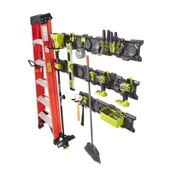 The RYOBI® LINK Modular Storage System is designed to help customise your space, any space of any size. At the heart of the system are the high strength polymer wall rails (RSL2WR-2), designed to be easily installed with interlocking points, making its installation effortless. The innovative LINK shape diamonds on each rail enables you to connect different LINK hanging hooks, storage bins, shelves and crates to store; bicycles, brooms, ladders, hedge trimers, blowers, line trimmers, power tools, hand tools, garden tools, raincoats, sports equipment, shovels, hoses, rain boots and almost anything in your garage, utility room, shed, basement, workshop, etc. Whether you have a small or large space, RYOBI® LINK is here to help you get organised!