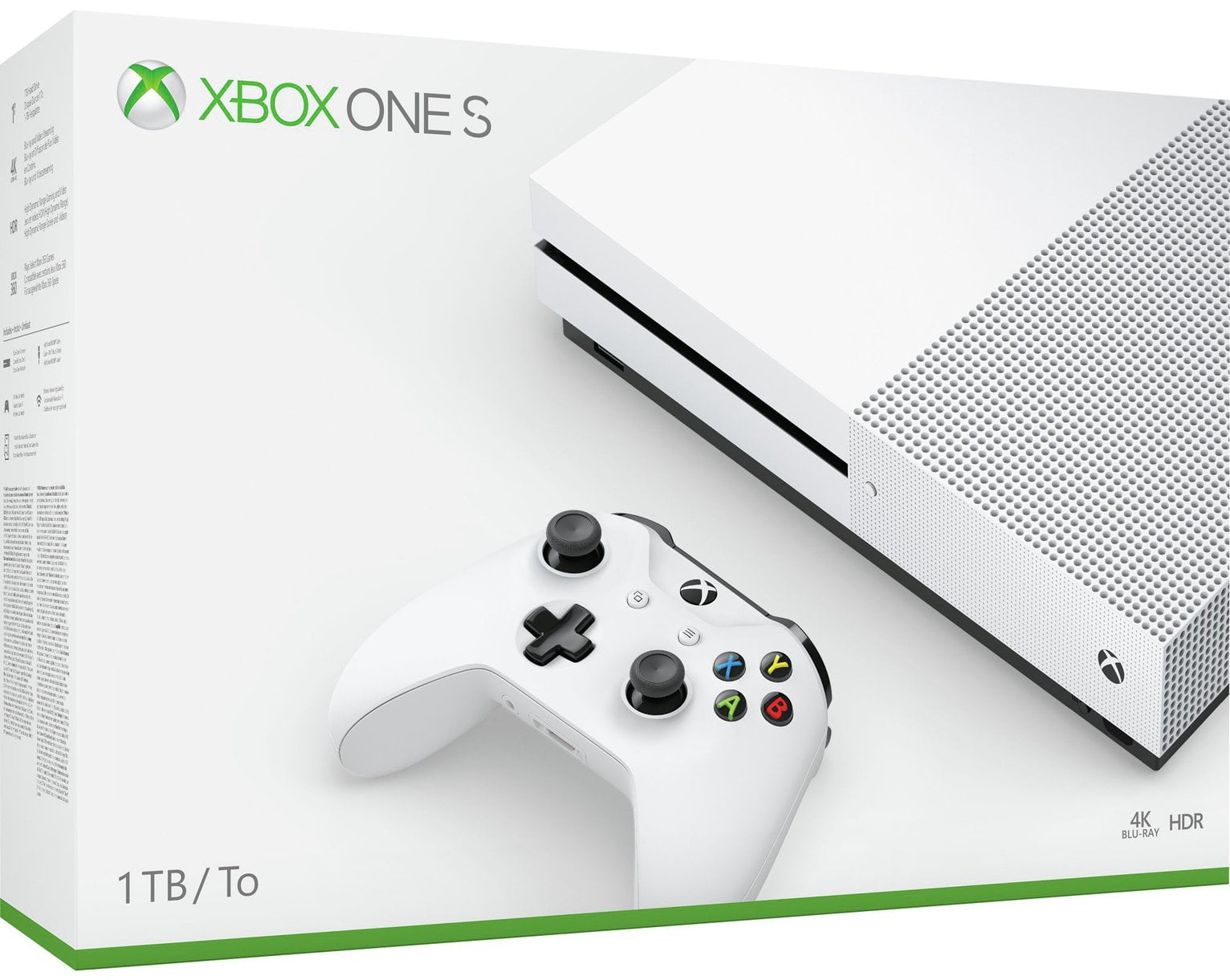 Xbox One S 1TB Console Includes: Xbox One S 1TB Console, Wireless Controller, HDMI cable (4K Capable), AC Power cable.